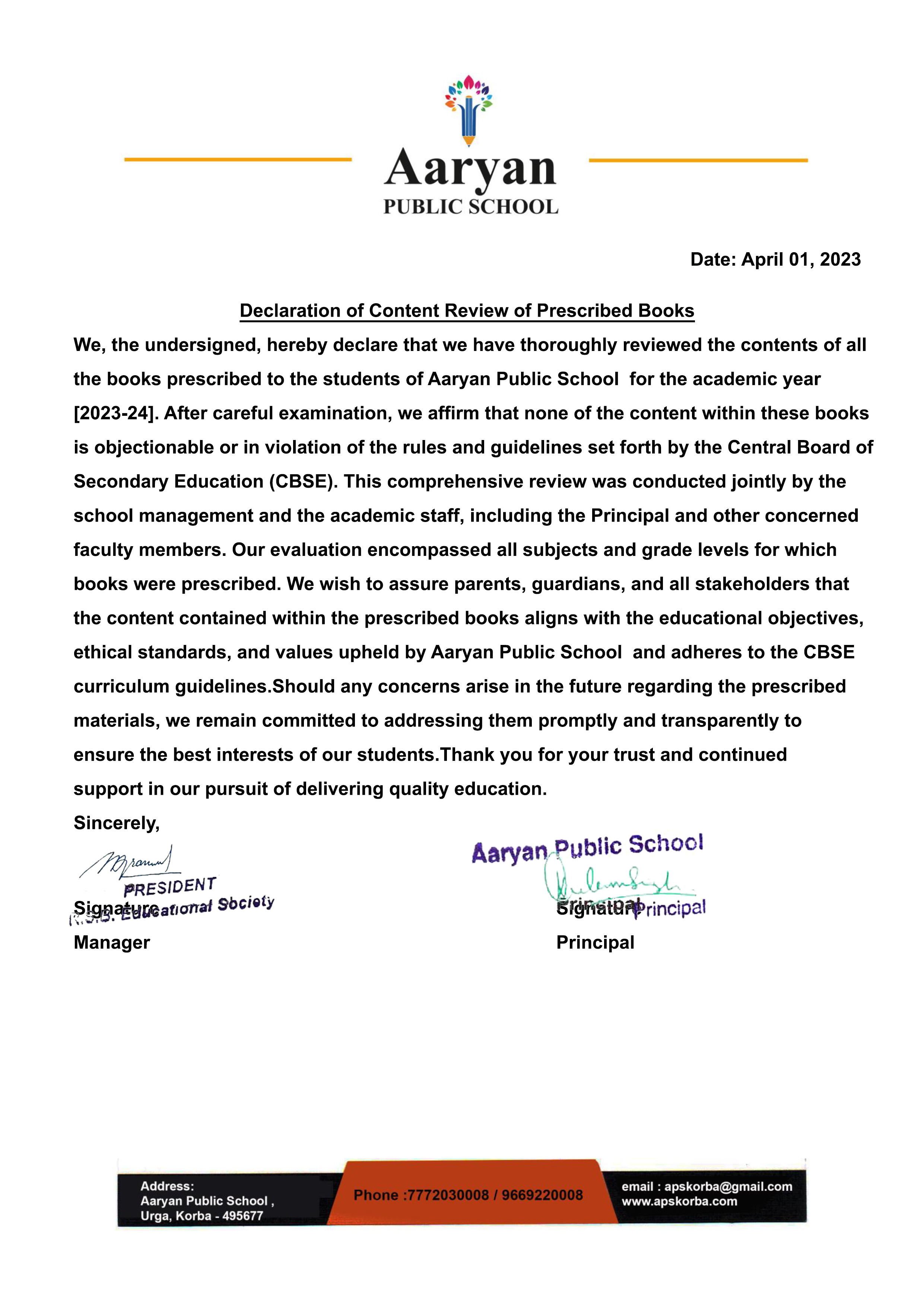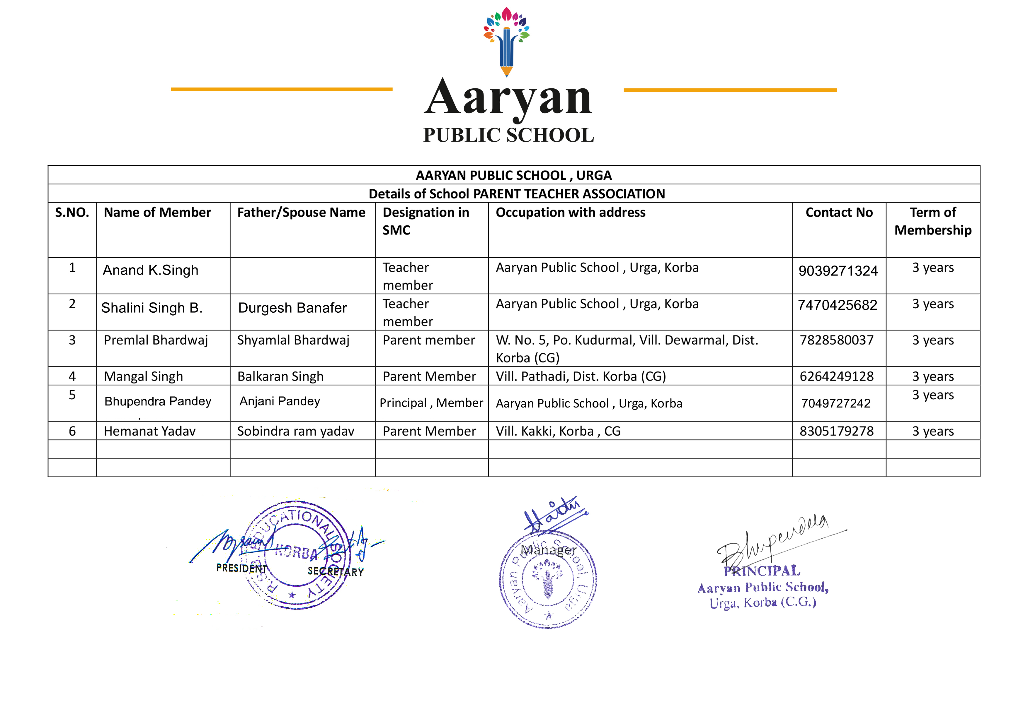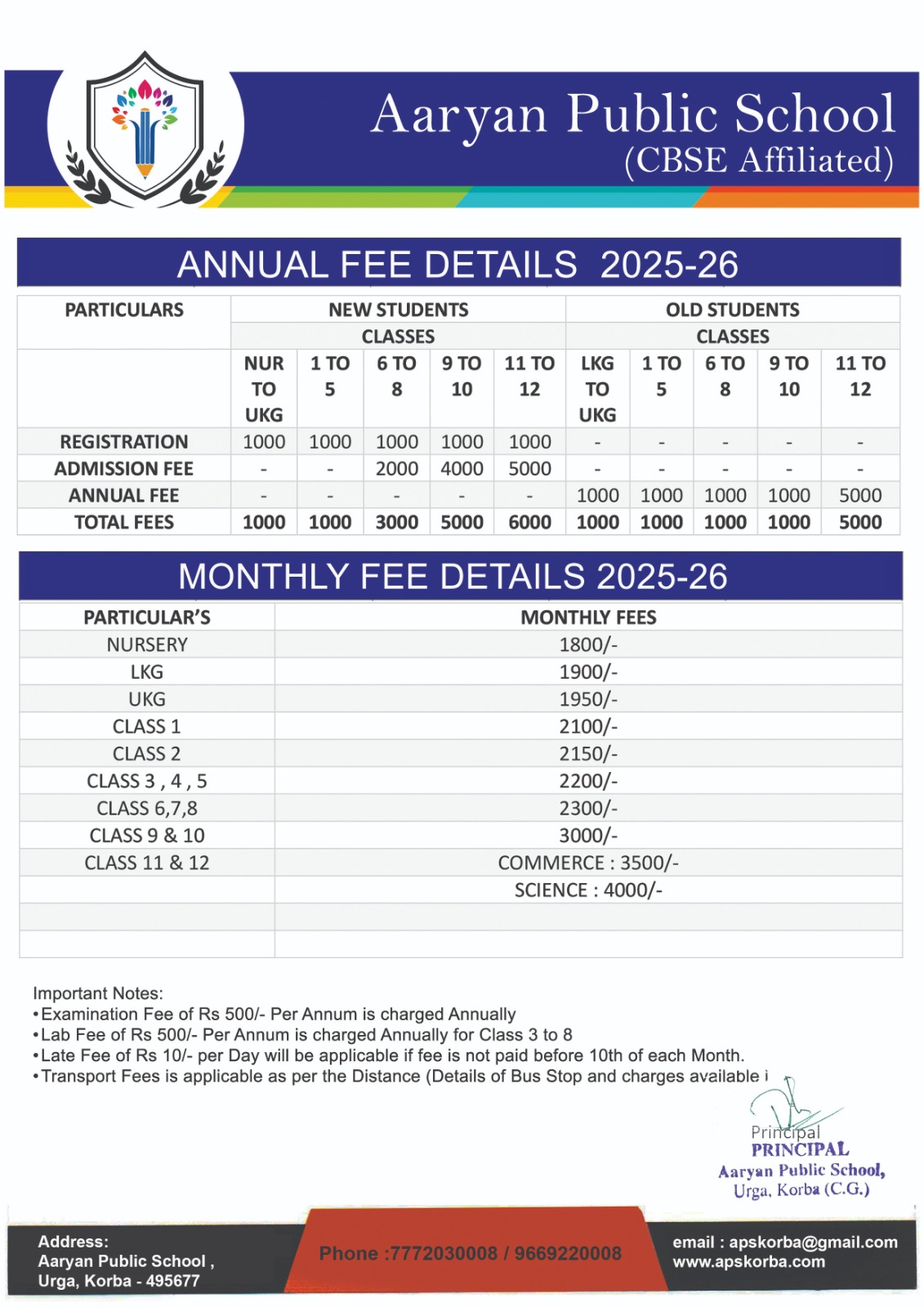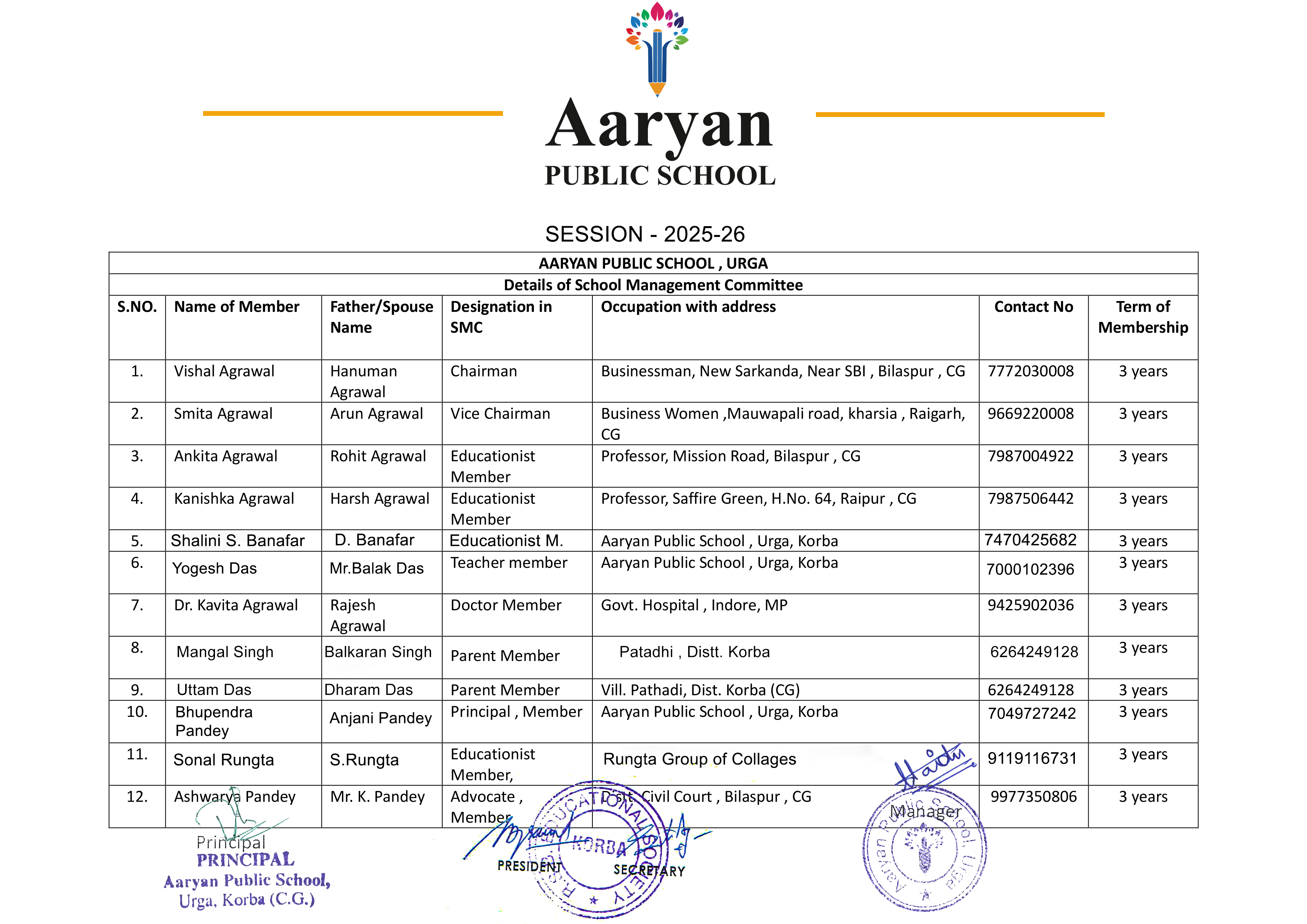 AARYAN PUBLCI SCHOOL , KORBA -CHAMPA ROAD, URGA , KORBA- 495677 |